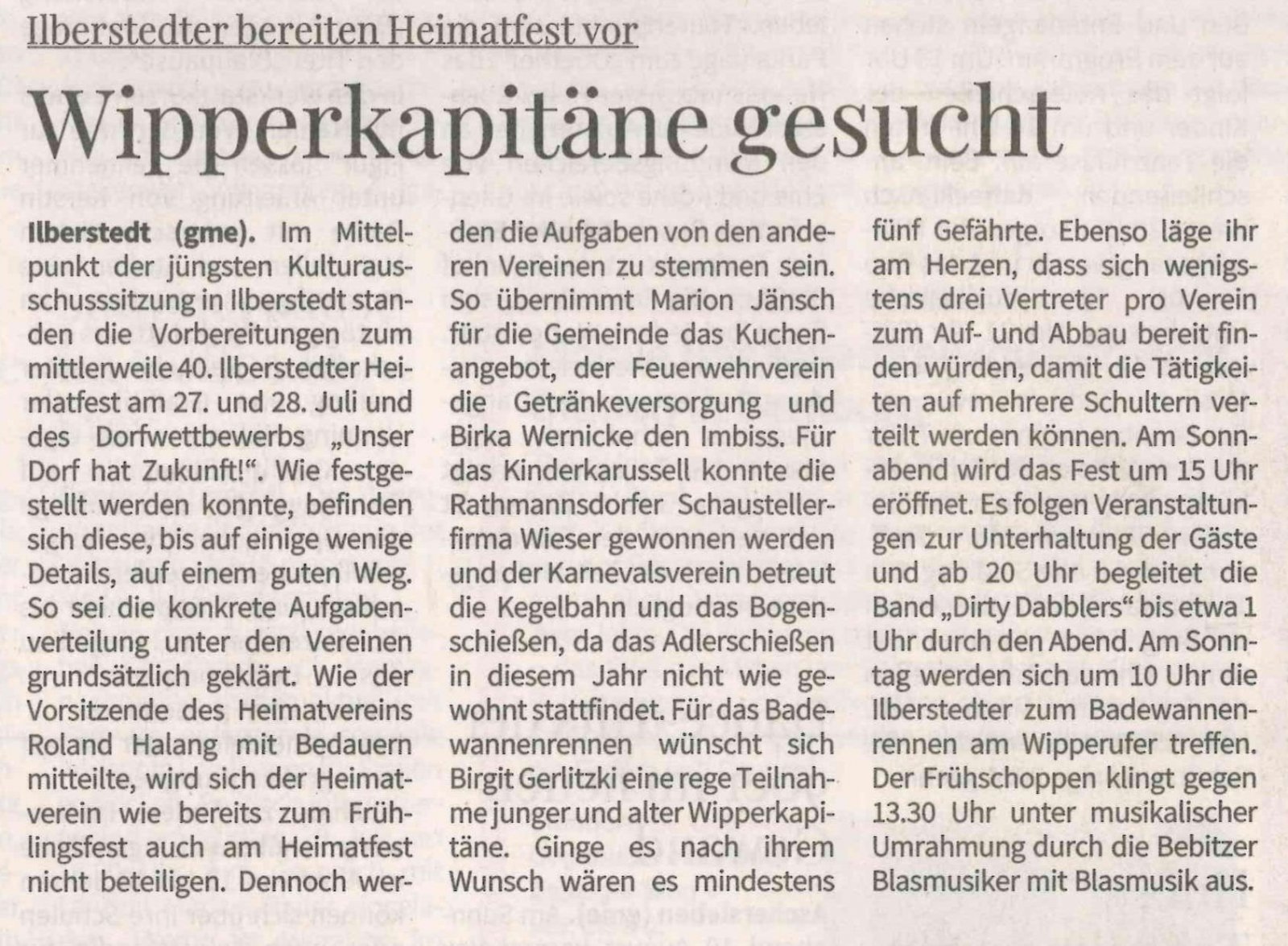 der Berichterstatter des Artikels aus der Ausschusssitzung, Herr Kurt Kuchinke, hat in seiner Berichterstattung bedauerlicherweise zwei Fehlannahmen getroffen bzw. wichtige Hintergrundinformationen nicht erwähnt: Bedauerlicherweise kann der Heimatverein mit seinem Mitgliederbestand, von denen sehr viele Mitglieder bereits in einem stattlichen Alter sind, das Frühlingsfest nicht mehr alleine durch- führen, schon gar nicht, wenn die Rahmenbedingungen durch die Gemeinde zusätzlich erschwert werden. „Wir schaffen das nicht mehr alleine“. Immerhin haben wir 16 Heimatfeste alleine organisiert und durchgeführt. Im Jubiläumsjahr zum 1.000-jährigen Tanzwunder wurde das Frühlingsfest erstmalig als Gemeinschaftsaktion des Ilberstedter Organisationskomitees für das Festjahr durchgeführt.
