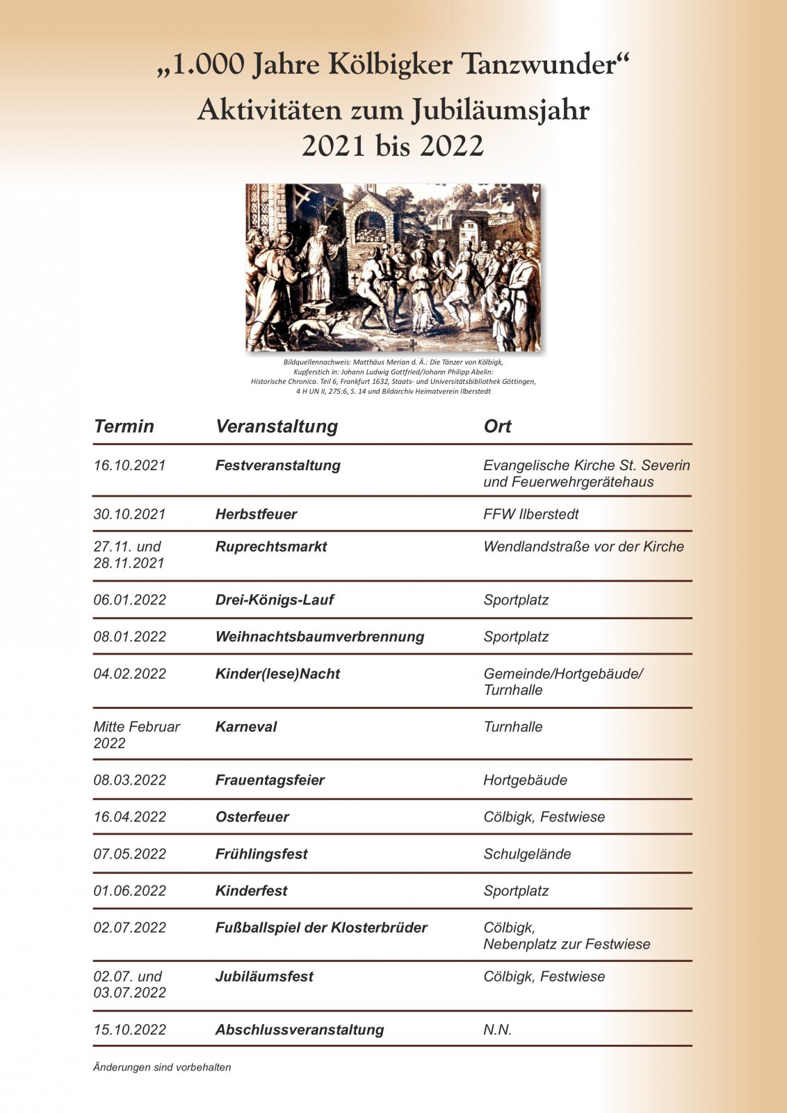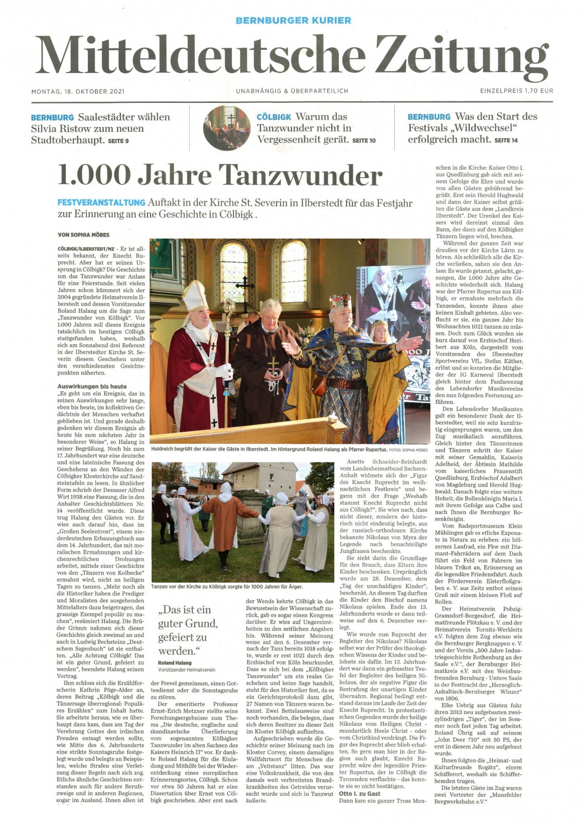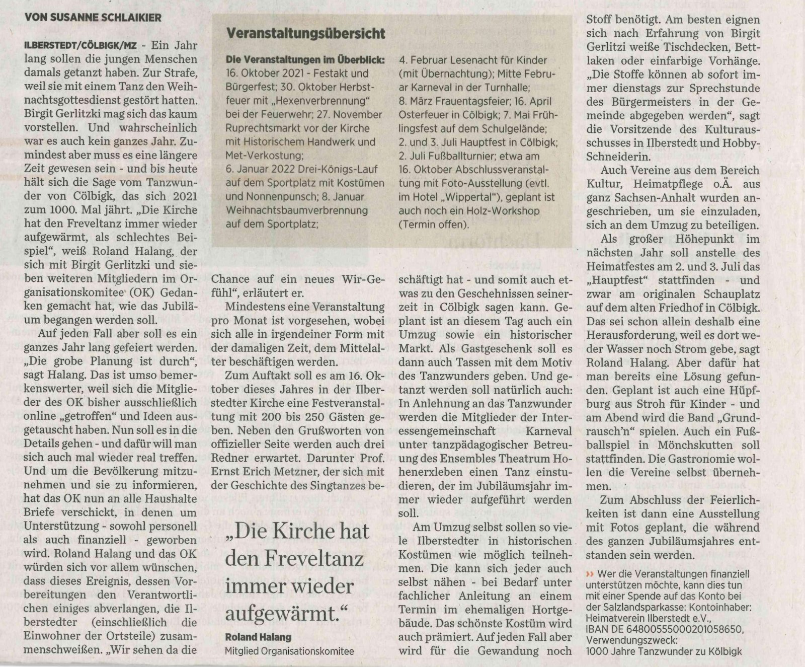 Diese MZ-Beiträge und weiteren Hinweise informieren über den Stand der Vorbereitungen des Organisationskomitees für das Jubliläumsjahr 2021 bis 2022 zum "Tanzwunder von Kölbigk". In der Literatur und in der Forschung hat dieses Ereignis eines einjährigen Dauertanzes vor 1.000 Jahren breiten Niederschlag gefunden in der Bezeichnung "Das Tanzwunder von Kölbigk", mit "K" geschrieben, entgegen der jetzigen Namensgebung des Ilberstedter Ortsteiles Cölbigk mit "C". Das hat also alles seine Richtigkeit. Bitte lesen Sie selbst: