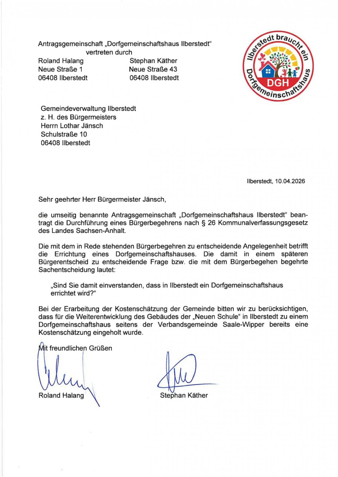 Die Antragsgemeinschaft "Dorfgemeinschaftshaus Ilberstedt" beantragt die Durchführung eines Bürgerbegehrens nach § 26 Kommunalverfassungsgesetz des Landes Sachsen-Anhalt.