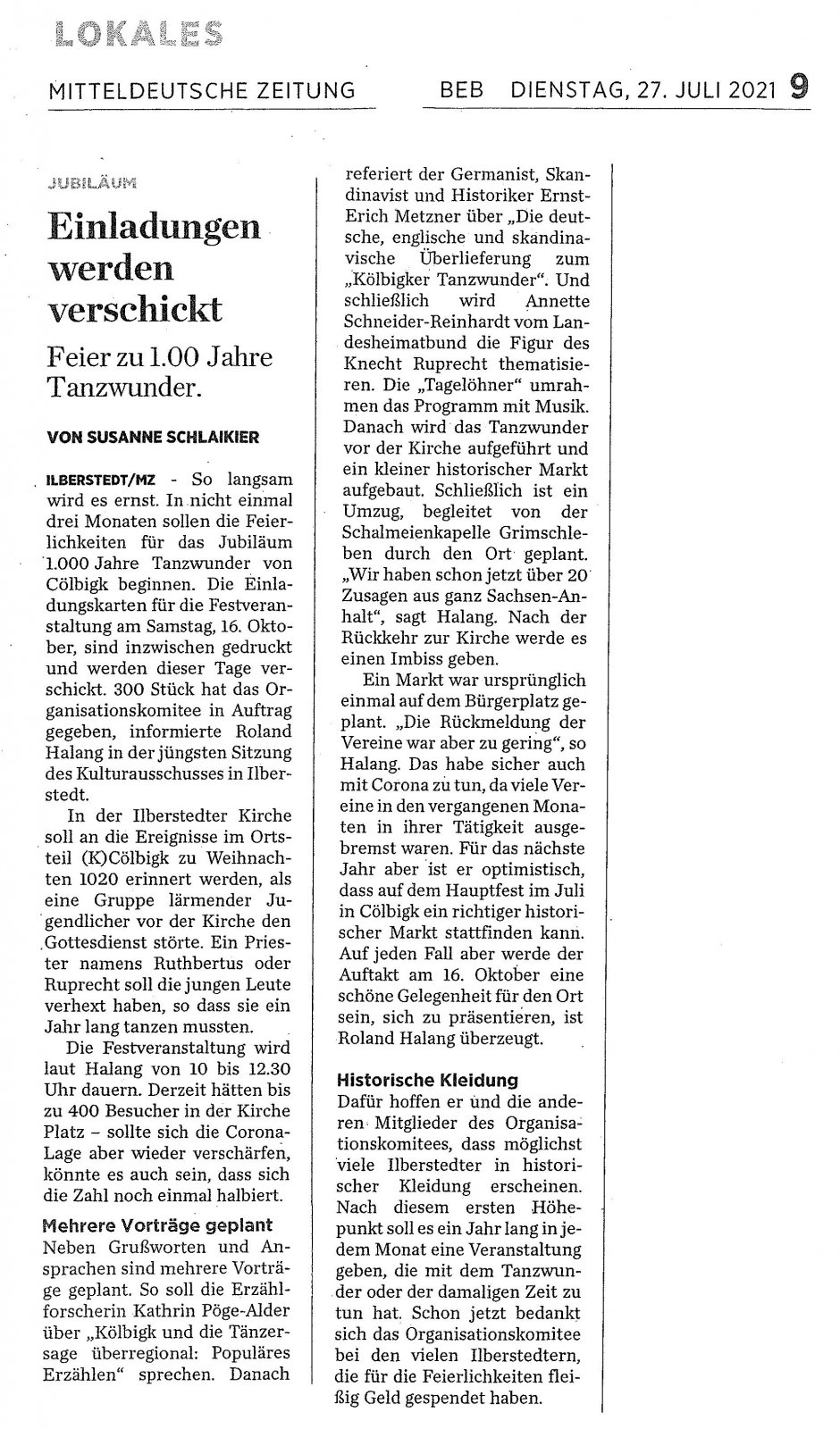 Diese MZ-Beiträge und weiteren Hinweise informieren über den Stand der Vorbereitungen des Organisationskomitees für das Jubliläumsjahr 2021 bis 2022 zum "Tanzwunder von Kölbigk". In der Literatur und in der Forschung hat dieses Ereignis eines einjährigen Dauertanzes vor 1.000 Jahren breiten Niederschlag gefunden in der Bezeichnung "Das Tanzwunder von Kölbigk", mit "K" geschrieben, entgegen der jetzigen Namensgebung des Ilberstedter Ortsteiles Cölbigk mit "C". Das hat also alles seine Richtigkeit. Bitte lesen Sie selbst: