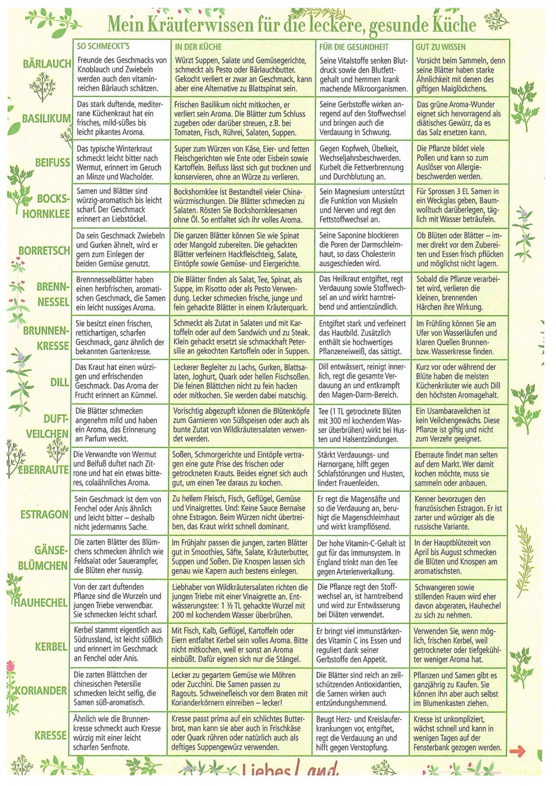 Aus dem Fundus unseres Wissens anbei unsere Übersicht "Mein Kräuterwissen für die leckere, gesunde Küche".